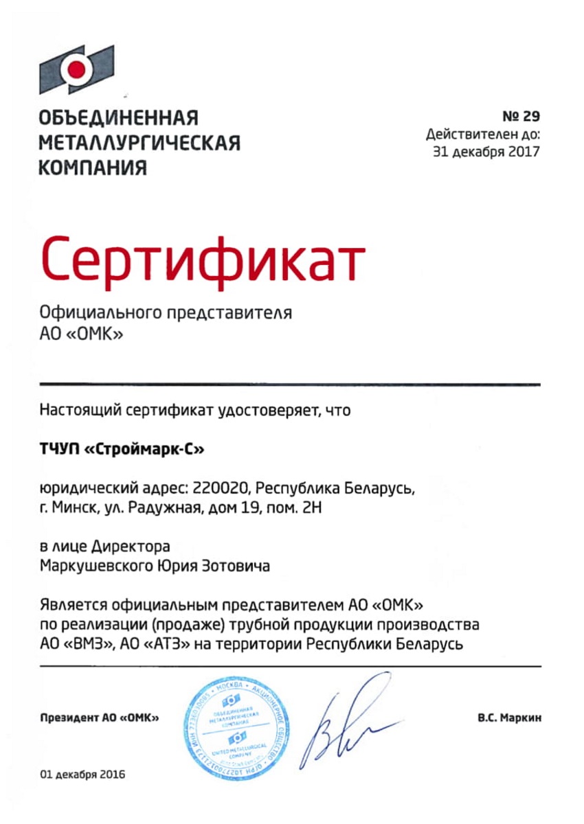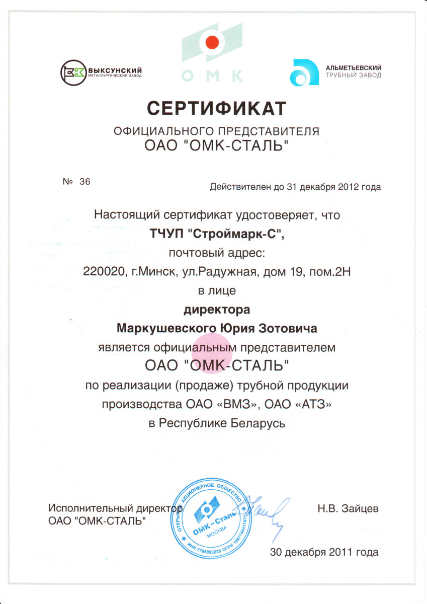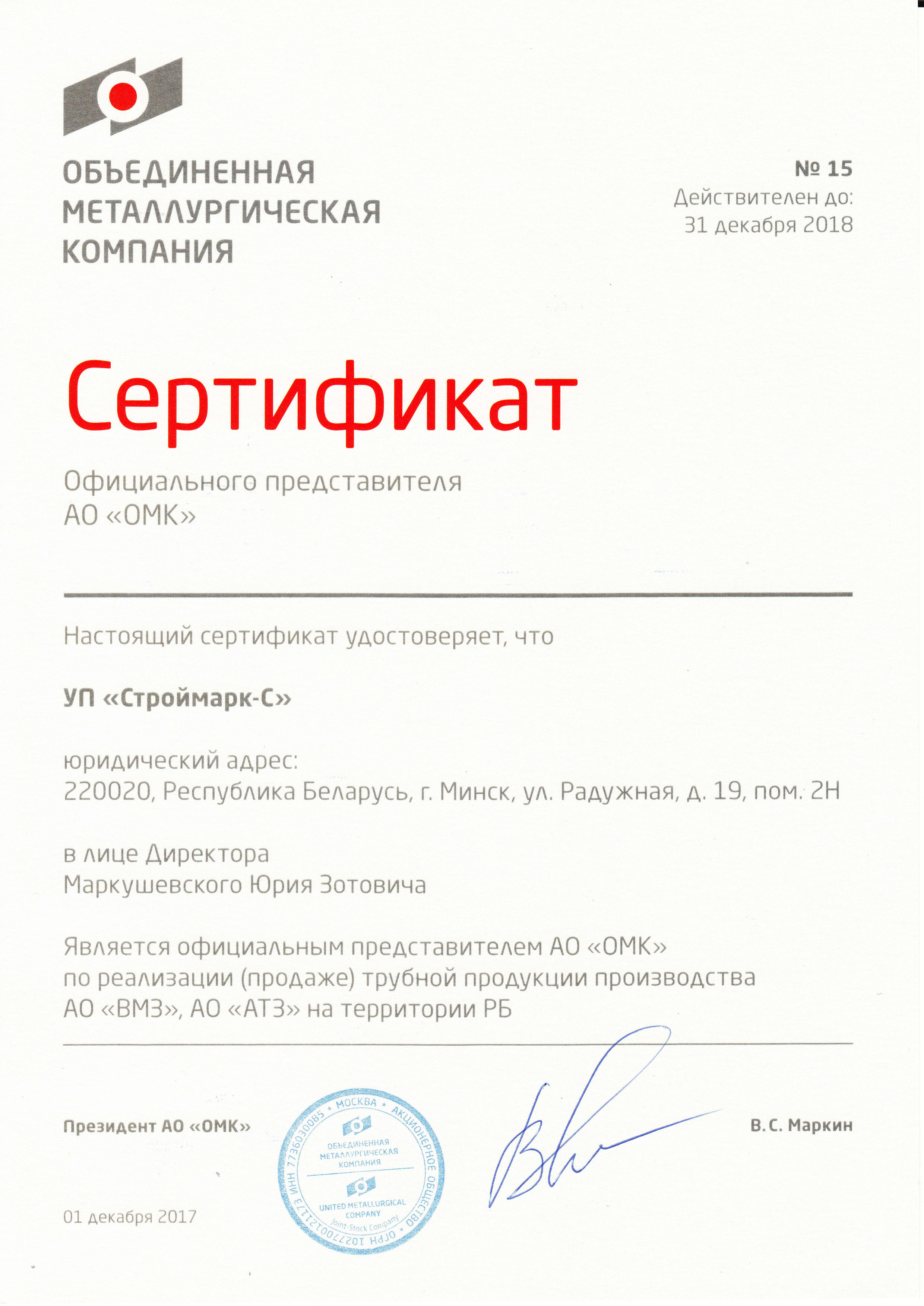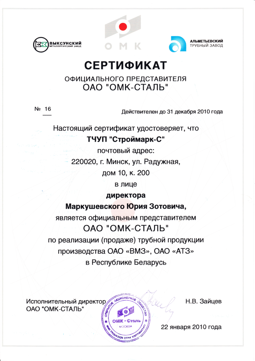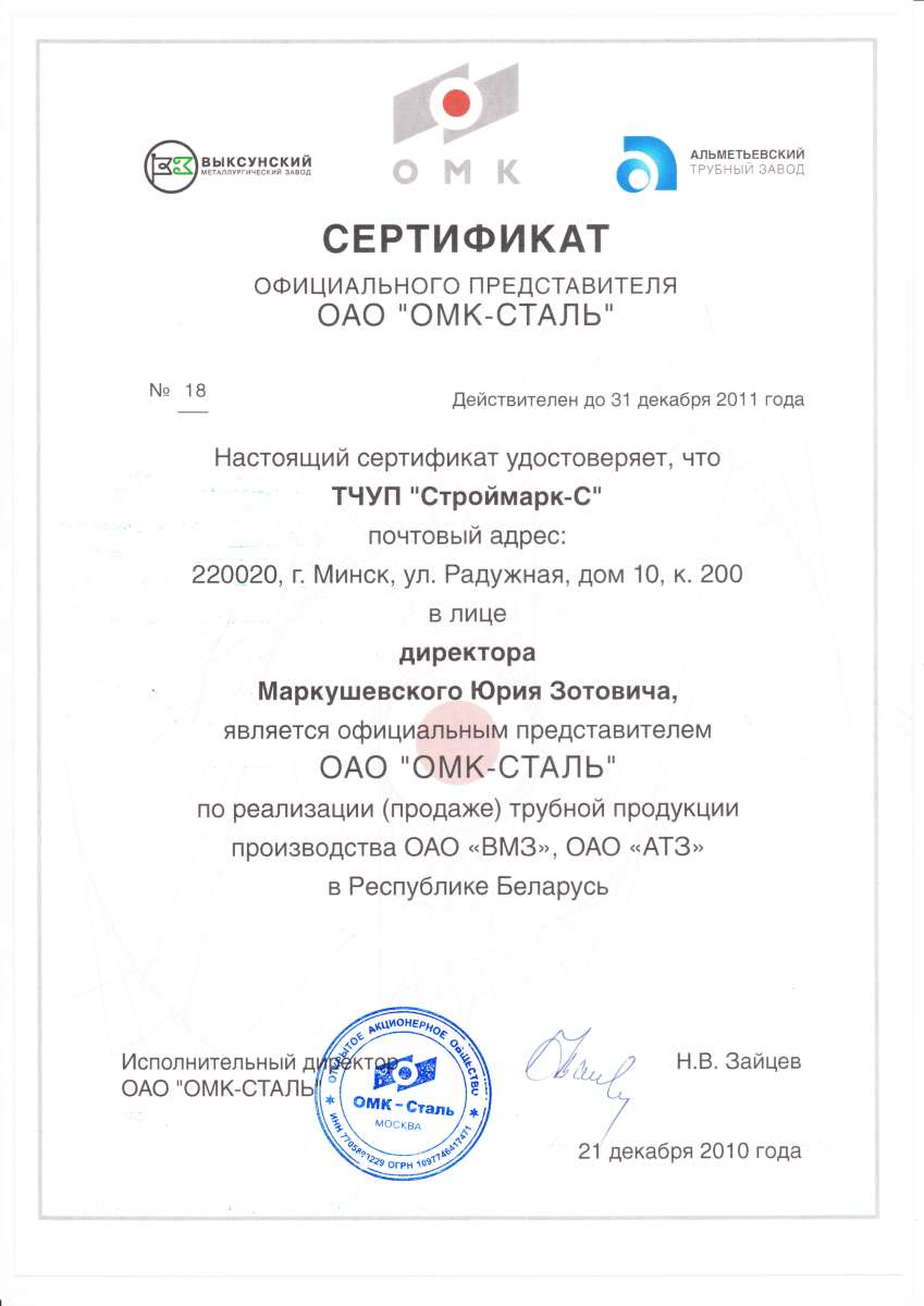 Настоящий сертификат удостоверяет, что ТЧУП "Строймарк-С" является официальным представителем АО "ОМК-Сталь" по реализации (продаже) трубной продукции производства АО "Выксунский металлургический завод" и АО "Альметьевский трубный завод" на территории Республики Беларусь.