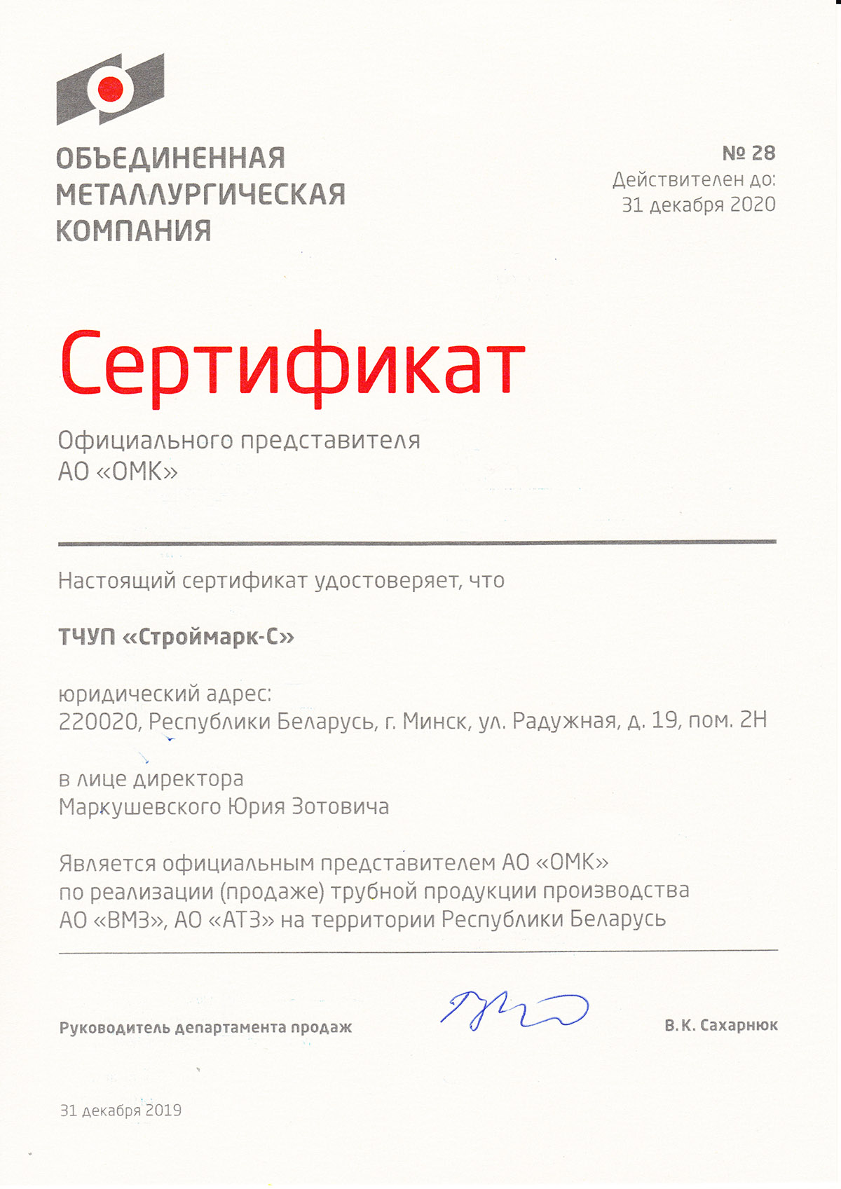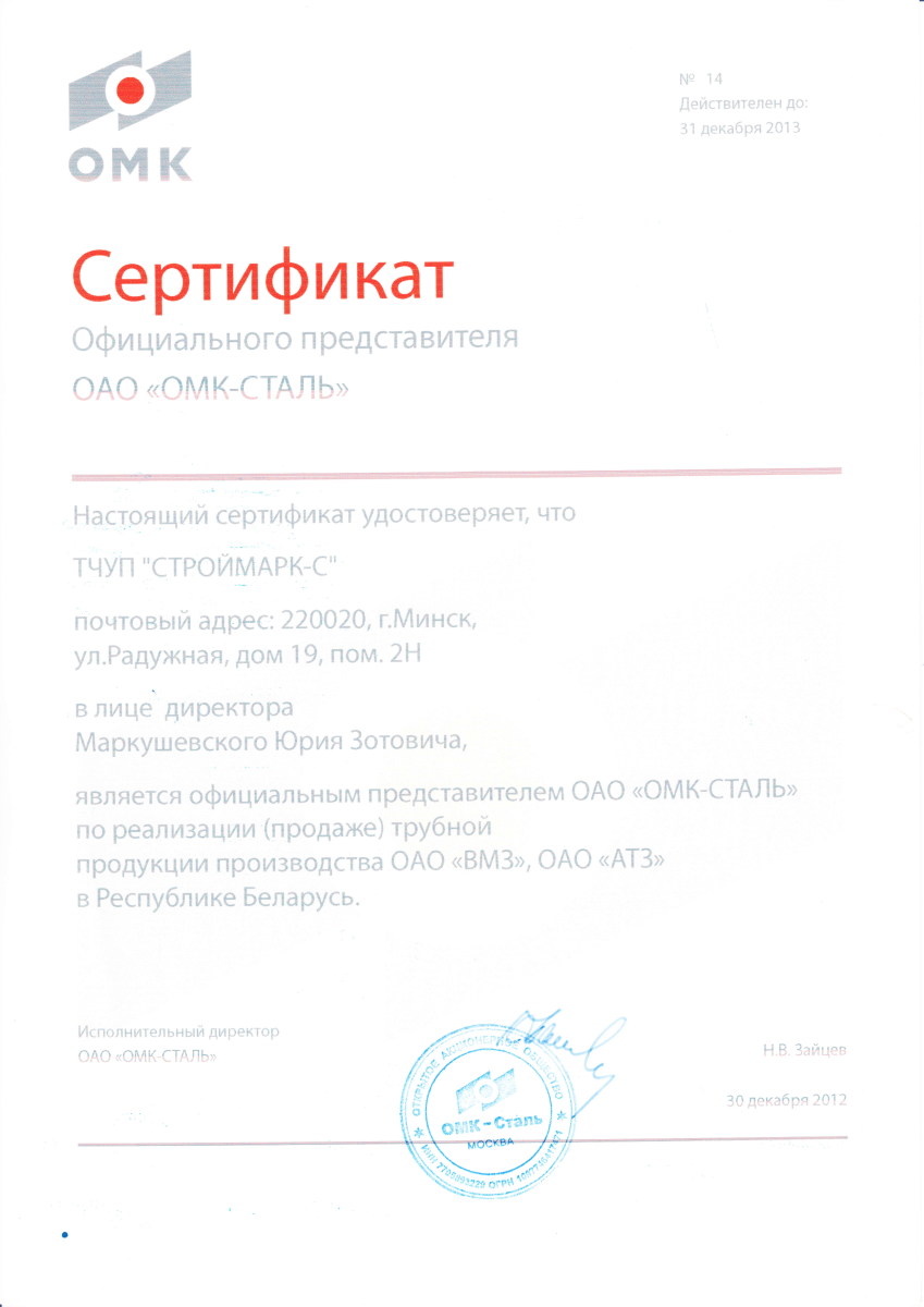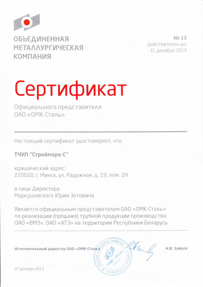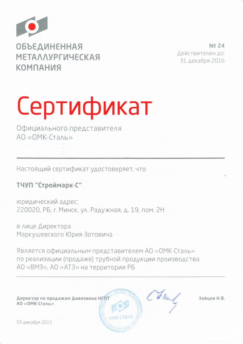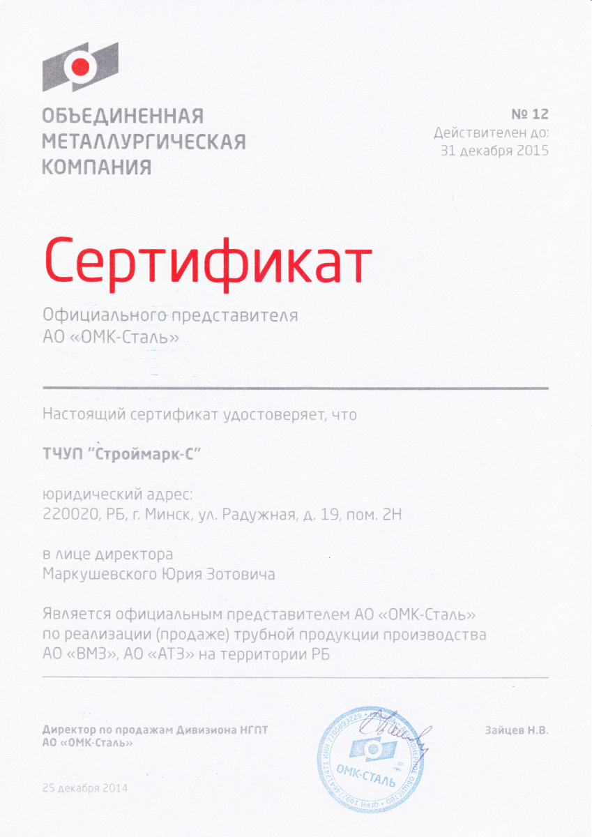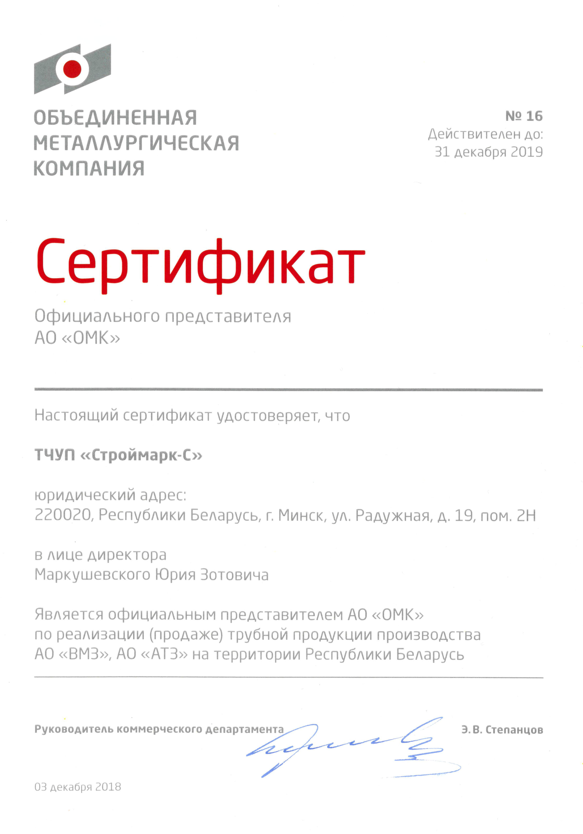 Настоящий сертификат удостоверяет, что ТЧУП "Строймарк-С" является официальным представителем АО "ОМК-Сталь" по реализации (продаже) трубной продукции производства АО "Выксунский металлургический завод" и АО "Альметьевский трубный завод" на территории Республики Беларусь.